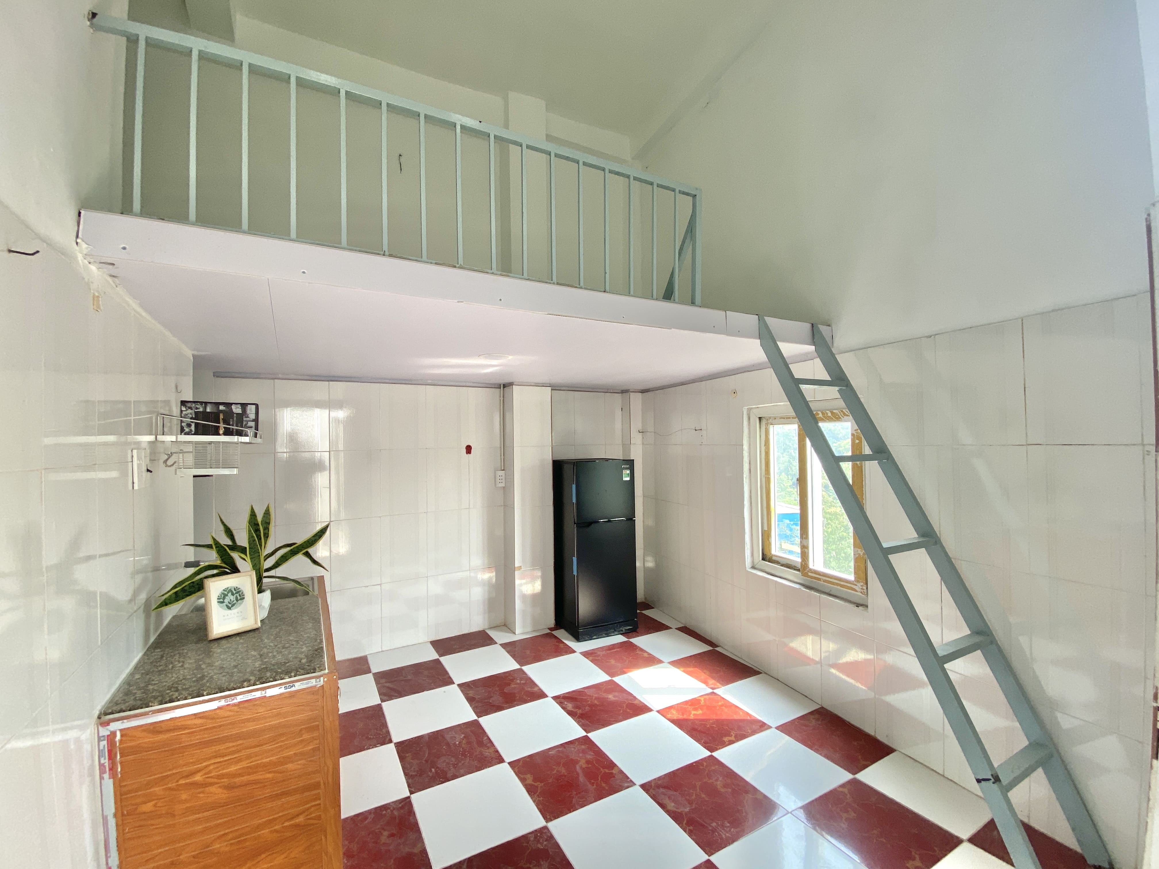 Phòng có gác được trang bị nội thất cơ bản gồm tủ lạnh, máy lạnh Casper đời mới, tủ đồ âm tường, moderm wifi riêng. Phần diện tích bếp và nhà vệ sinh biệt lập, được ngăn cách với ngăn chính bằng một cửa kéo. Toilet lắp sẵn quạt hút gắn tường, máy nước nóng và các thiết bị vệ sinh cơ bản.