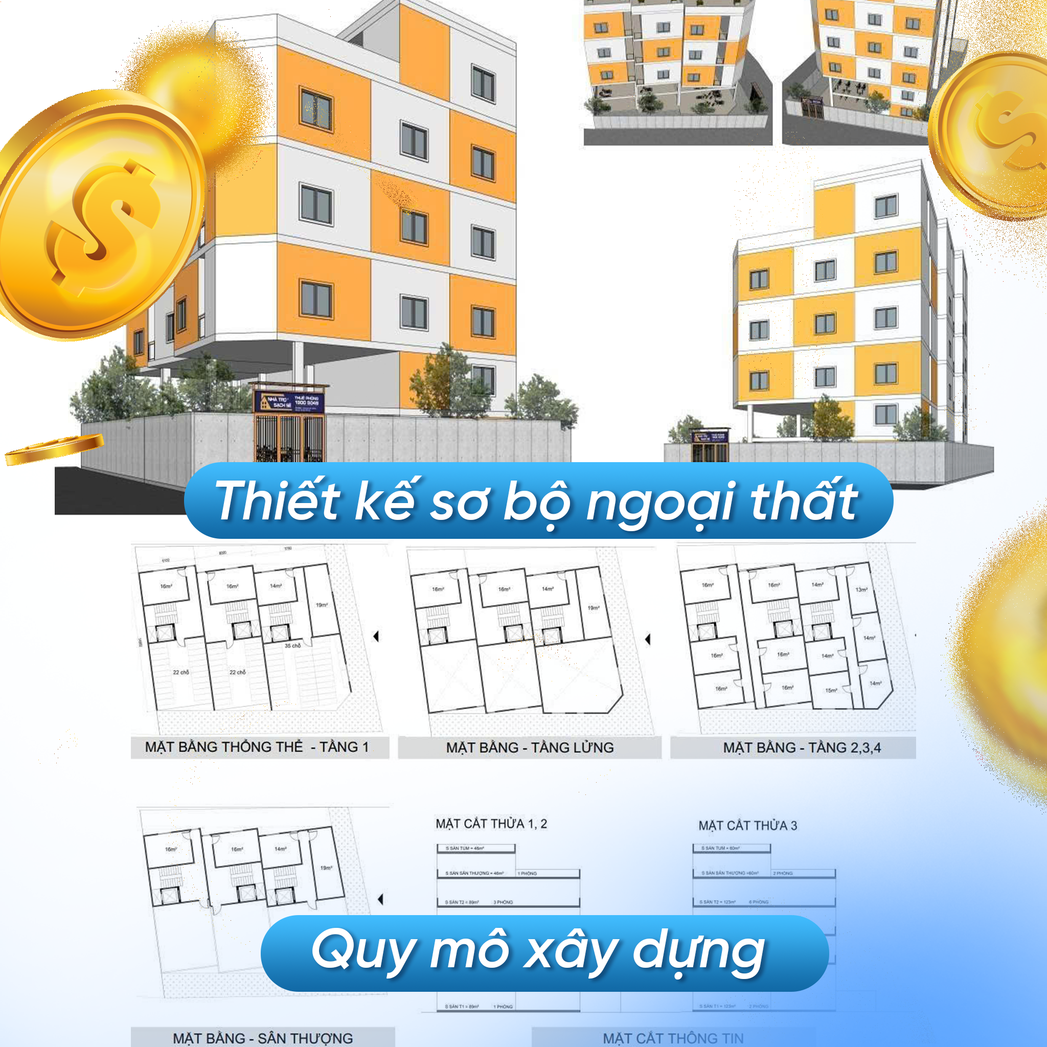 +) Ý tưởng Thiết kế: Bản vẽ sơ bộ, phối cảnh thiết kế nhà trọ 3D, cách bố trí phòng & số tầng.