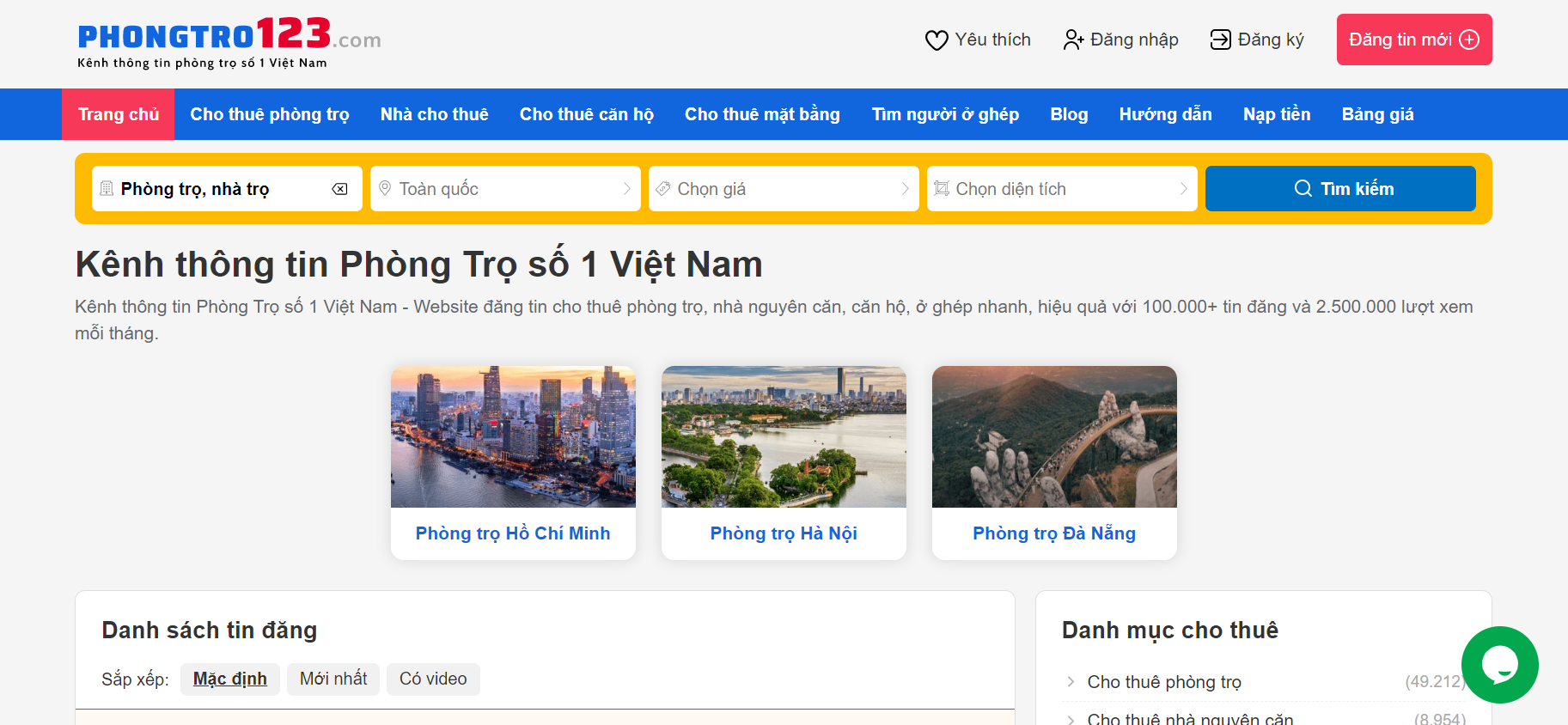 Phongtro123.com là kênh thông tin Phòng Trọ số 1 Việt Nam với hơn 100.000 tin đăng và hơn 2.500.000 lượt xem mỗi tháng. Giao diện của trang web thân thiện, dễ dàng sử dụng, được phân loại theo 4 đặc điểm chính là hình thức cho thuê, khu vực, giá và diện tích. Ưu điểm của trang web này các sản phẩm phòng trọ cho thuê đa dạng, phù hợp với túi tiền của sinh viên. Bên cạnh đó, bạn có thể liên hệ với người bán thông qua số điện thoại, hoặc nhắn tin qua Zalo.