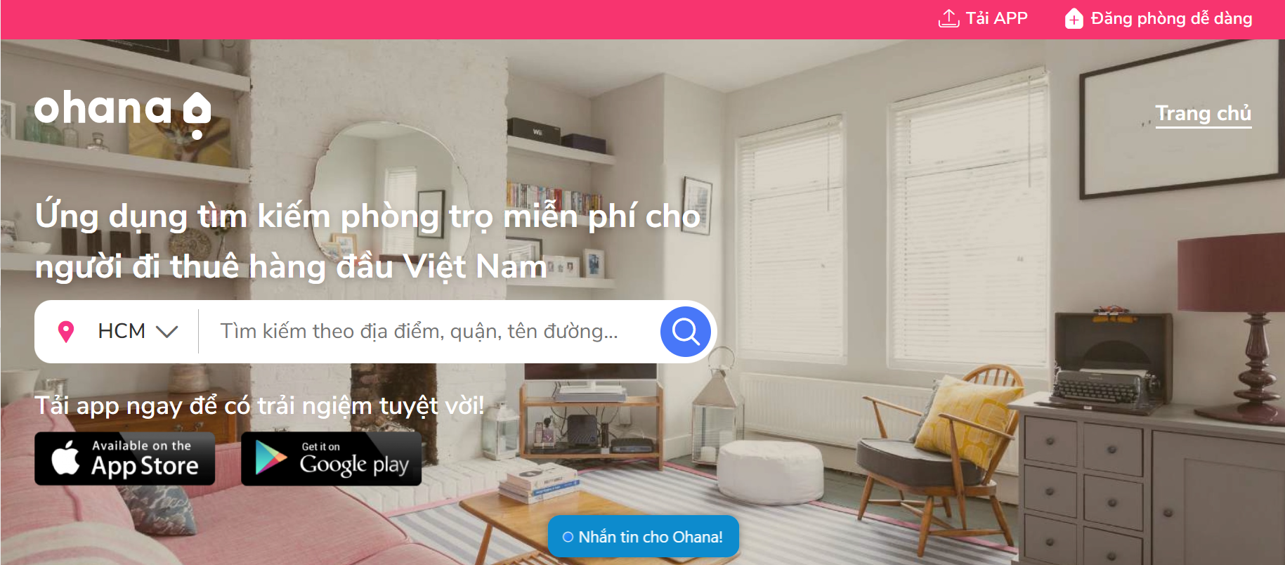Ohana là ứng dụng thông minh, giúp bạn tìm phòng trọ cho thuê hoặc tìm bạn ở ghép thông qua việc kết nối người đi thuê với người cho thuê phòng trọ. Bạn sẽ dễ dàng tìm kiếm phòng theo địa điểm, quận, tên đường… ngay trên trang chủ tìm kiếm. Sau đó website sẽ giúp bạn lọc theo giá, tiện ích, loại phòng, hoặc giới tính để tìm được phòng phù hợp nhất. Tuy nhiên, nhược điểm lớn nhất của Ohana là chỉ tập trung vào hai thành phố lớn đó là Hà Nội và TP Hồ Chí Minh, do đó chưa đáp ứng được nhu cầu lớn của khách hàng. Hiện trang web này cũng đã có ứng dụng trên Google Play và App Store.